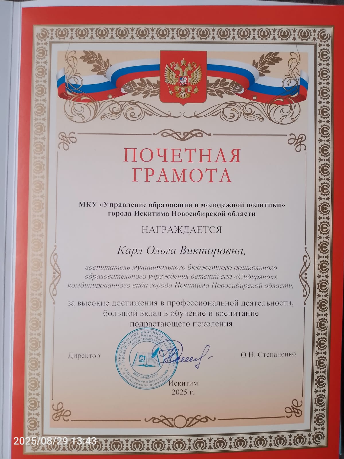 Почетная грамота "Управления образования и молодёжной политики г.Искитима"